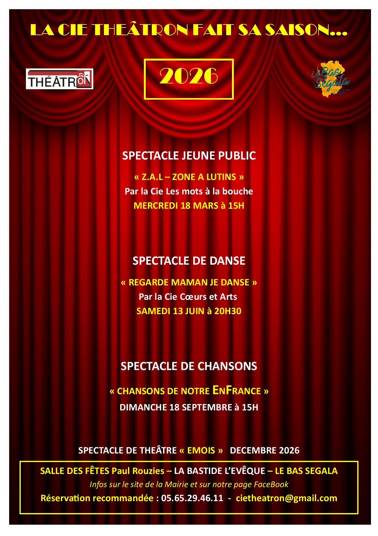 « La Cie Théâtron fait sa saison… 2026 » programmation de 4 spectacles vivants: Théâtre, danse, chant-musique et spectacle jeune public.